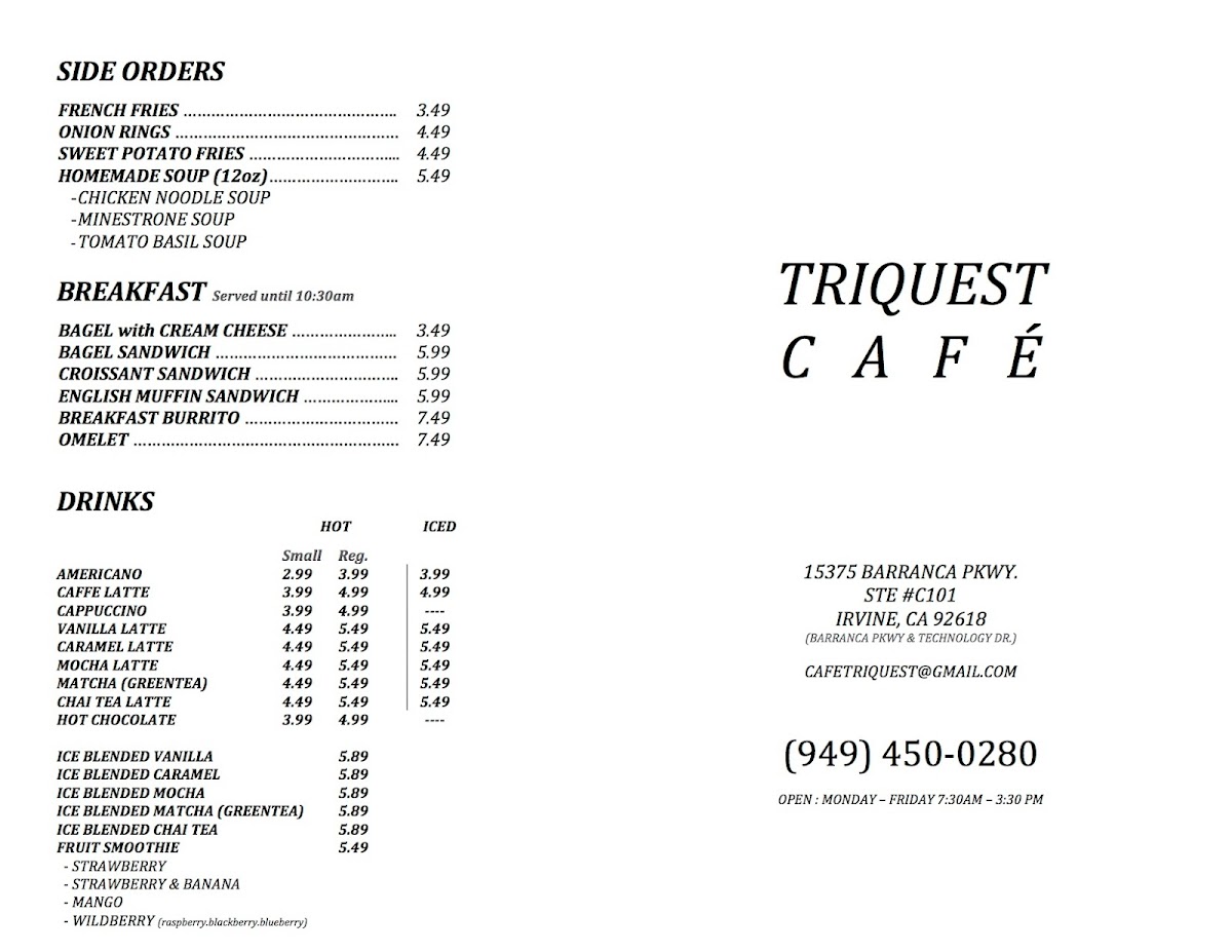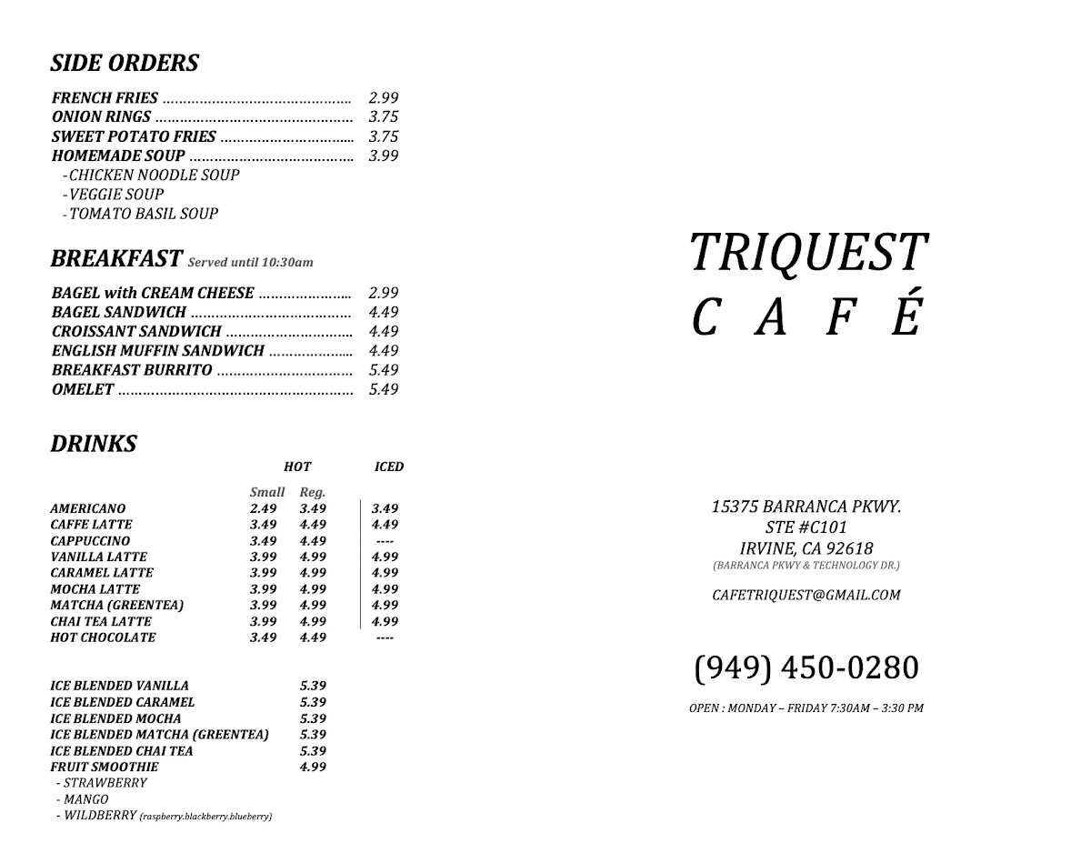 Welcome to Triquest Cafe, the perfect lunchtime haven nestled in Irvine, CA. This cozy spot serves an impressive array of offerings, from hot sandwiches to charbroiled burgers, each crafted with quality ingredients to tantalize your taste buds.